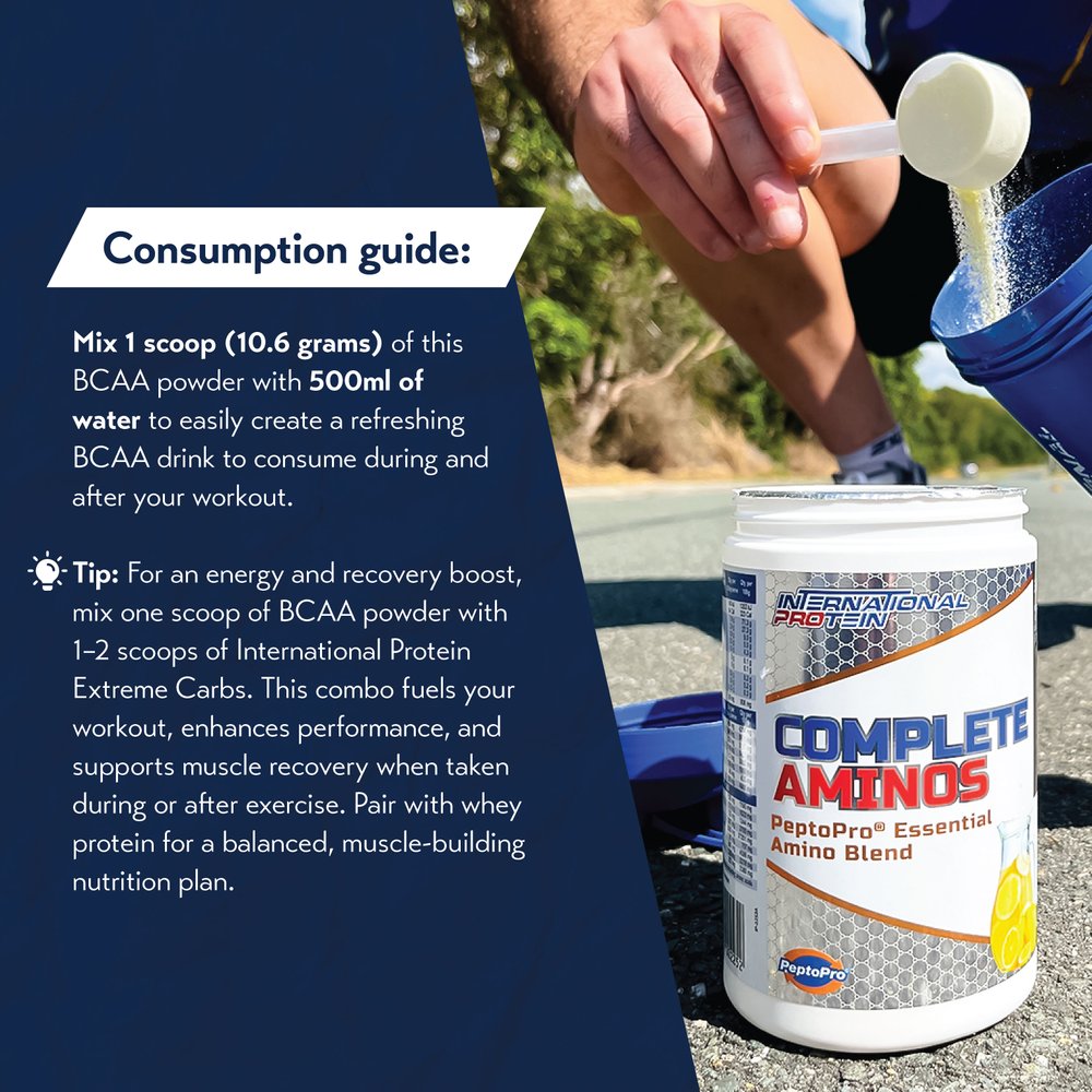 Mix 10.6g (1 SCOOP) with 500ml of water and 40g – 80g (1 – 2 SCOOPS) of International Protein Extreme Carbs and consume during and after intense activity.