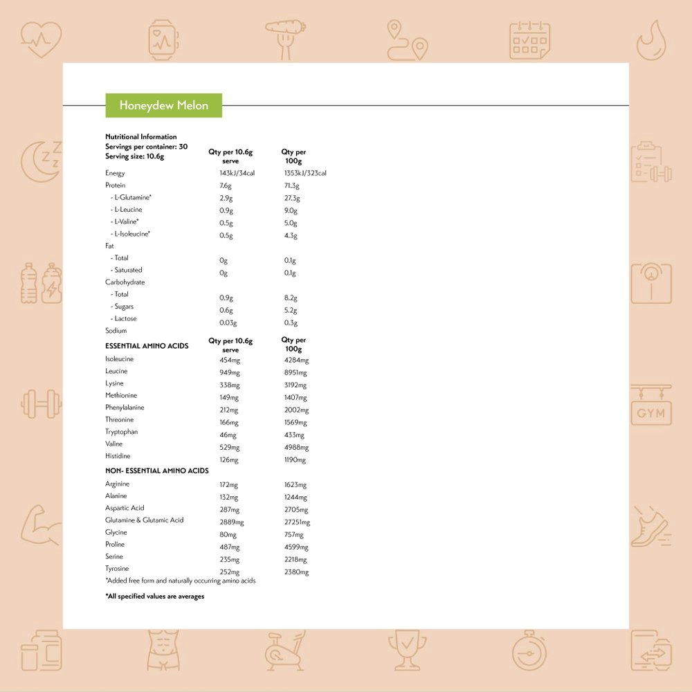 | Honeydew Melon: Peptopro® Hydrolysed Casein, L- Glutamine, Flavours, Branched Chain Amino Acids (L- Leucine, L-Isoleucine, L-Valine), Food Acids (Citric Acid, Malic Acid), Natural Colours (Copper Chlorophyllin), Sweetener (Sucralose). |