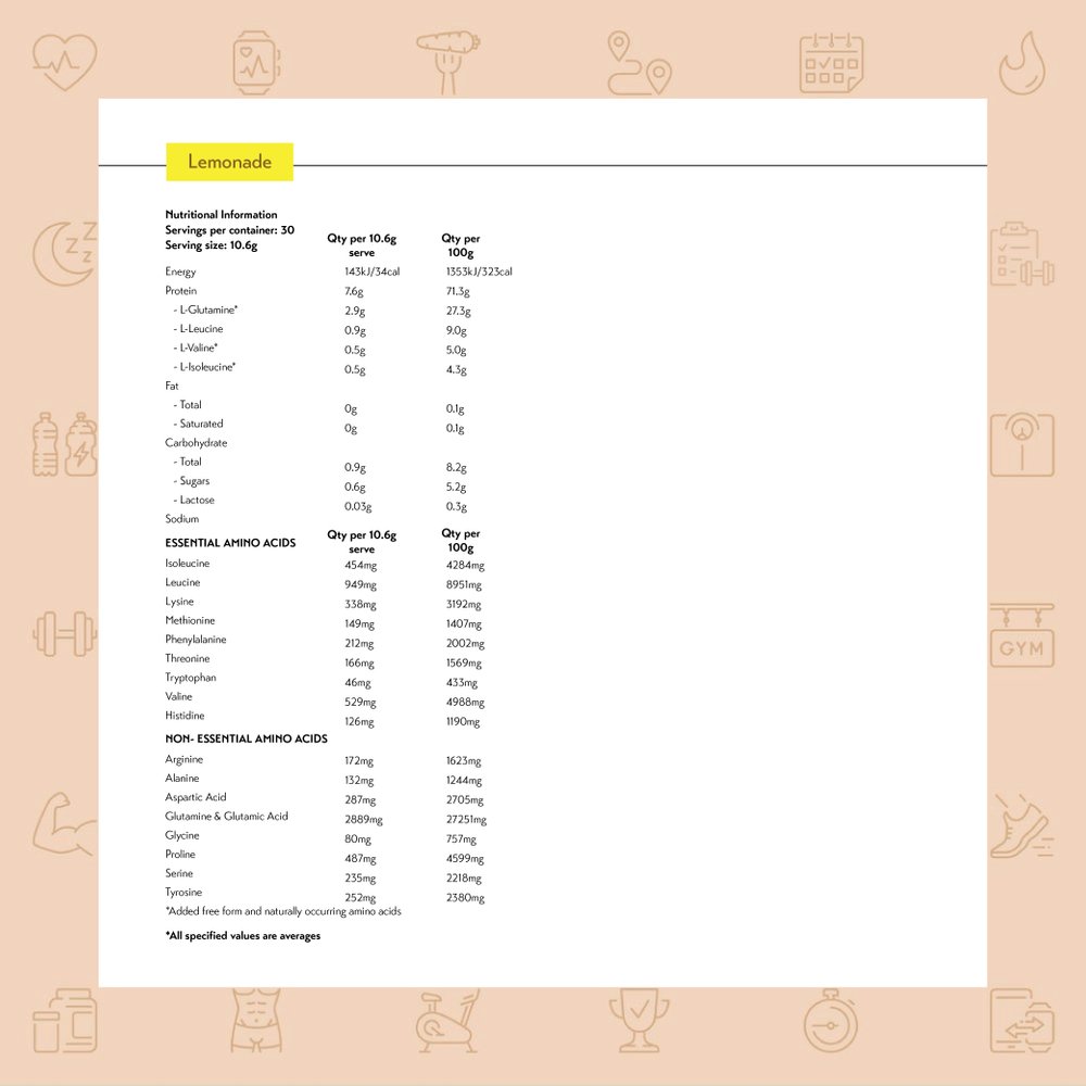 | Lemonade: Peptopro® Hydrolysed Casein, L- Glutamine, Flavours, Branched Chain Amino Acids (L- Leucine, L-Isoleucine, L-Valine), Food Acids (Citric Acid, Malic Acid), Natural Colours (Curcumin), Sweetener (Sucralose). |