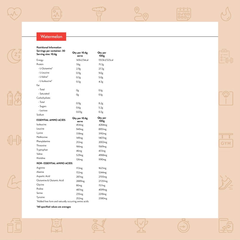 | Watermelon: Peptopro® Hydrolysed Casein, L- Glutamine, Flavours, Branched Chain Amino Acids (L- Leucine, L-Isoleucine, L-Valine), Food Acids (Citric Acid, Malic Acid), Natural Colours (#Beetroot juice extract), Sweetener (Sucralose). |