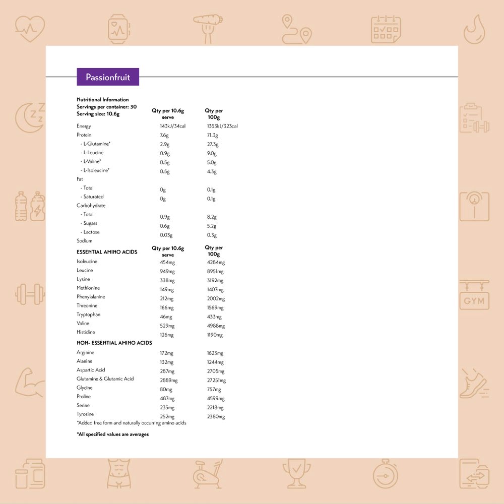 | Passionfruit: Peptopro® Hydrolysed Casein, L- Glutamine, Flavours, Branched Chain Amino Acids (L- Leucine, L-Isoleucine, L-Valine), Food Acids (Citric Acid, Malic Acid), Natural Colours (Curcumin), Sweetener (Sucralose). |