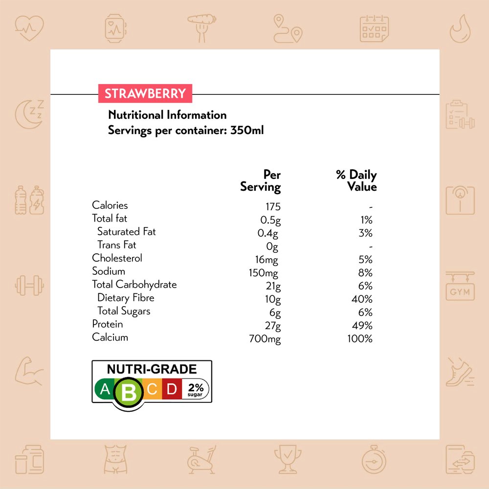 Strawberry: Milk Protein Isolate Powder, Milk Protein Concentrate, Skim Milk Powder, Maltodextrin, Polydextrose, Strawberry flavor, Sodium hydrogen carbonate, Calcium carbonate, Sucrose esters of fatty acids, Gellan gum, Tomato color, Acesulfame potassium, Sucralose, Purified water |