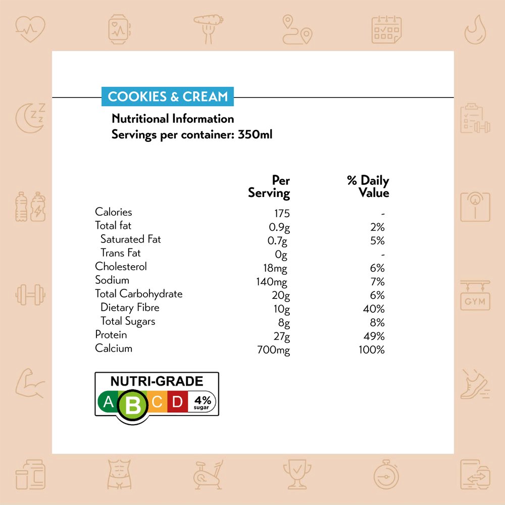 Cookies & Cream: Purified Water, Whey Protein Isolate Powder, Milk Protein Concentrate, Skim Milk Powder, Nondigestible Maltodextrin, Polydextrose, Cookie Powder(Flour, Shortening, Lecithin), Cocoa Powder, Choco Cookie Flavor, Vanila Ice Cream Flavor, Sodium Carbonate, Sodium Carbonate, Sucrose Esters of Fatty Acids, Microcrystalline Cellulose, Cellulose Gum, Sweet Flavor, Gellan Gum, Milk Cream, Carrageenan, Acesulfame Potassium, Sucralose |