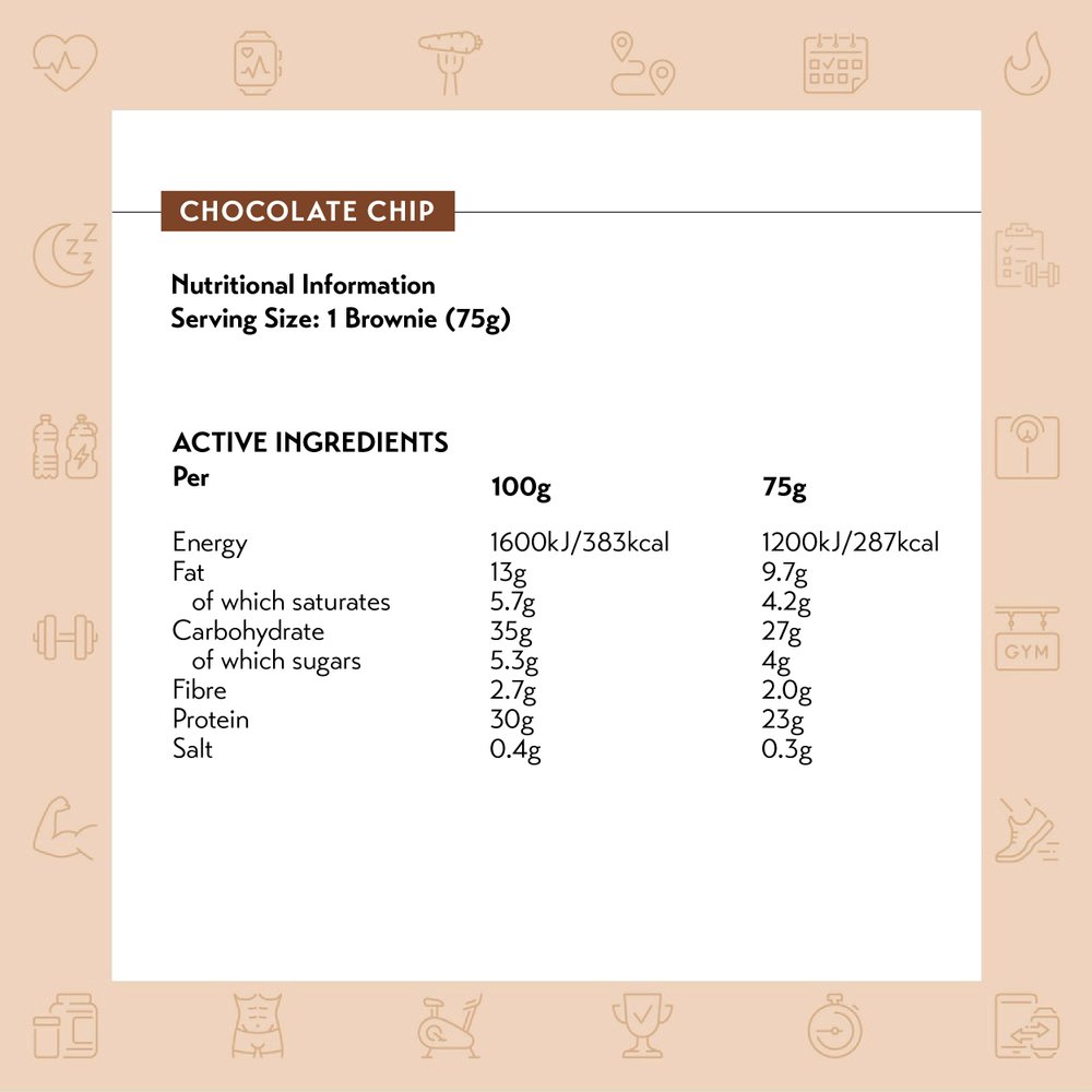 | Chocolate Chip: Milk Protein, Humectant (Vegetable Glycerol), Glutamine Peptide (Wheat), Oat Flour, Vegetable Oil (Palm), Chocolate Chips (9%) (Cocoa Mass, Sugar, Emulsifier (Soya Lecithin), Flavouring), Maltodextrin, Soya Protein, Cocoa Powder, Raising Agents (Sodium Bicarbonate, Potassium Bitartrate), Flavouring, Sweetener (Sucralose) |