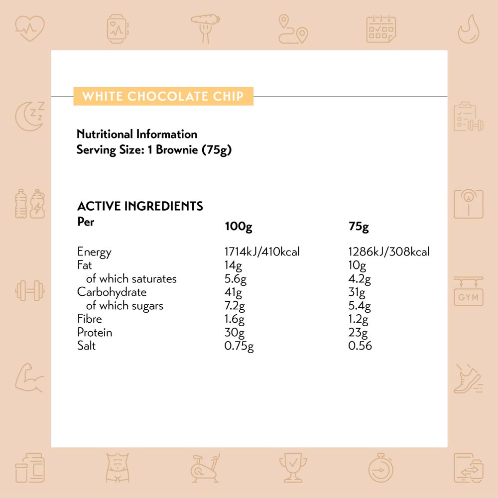 | White Chocolate Chip: White Chocolate Chip: Milk Protein, Humectant (Vegetable Glycerol), Oat Flour, Glutamine Peptide (Wheat), Maltodextrin, Vegetable Oils (Palm, Rapeseed), White Chocolate Chips (9%) (Sugar, Cocoa Butter, Whole Milk Powder, Emulsifier (Soya Lecithin), Flavouring), Soya Protein, Whole Milk Powder, Raising Agents (Sodium Bicarbonate, Potassium Bitartrate), Flavouring, Sweetener (Sucralose) |
