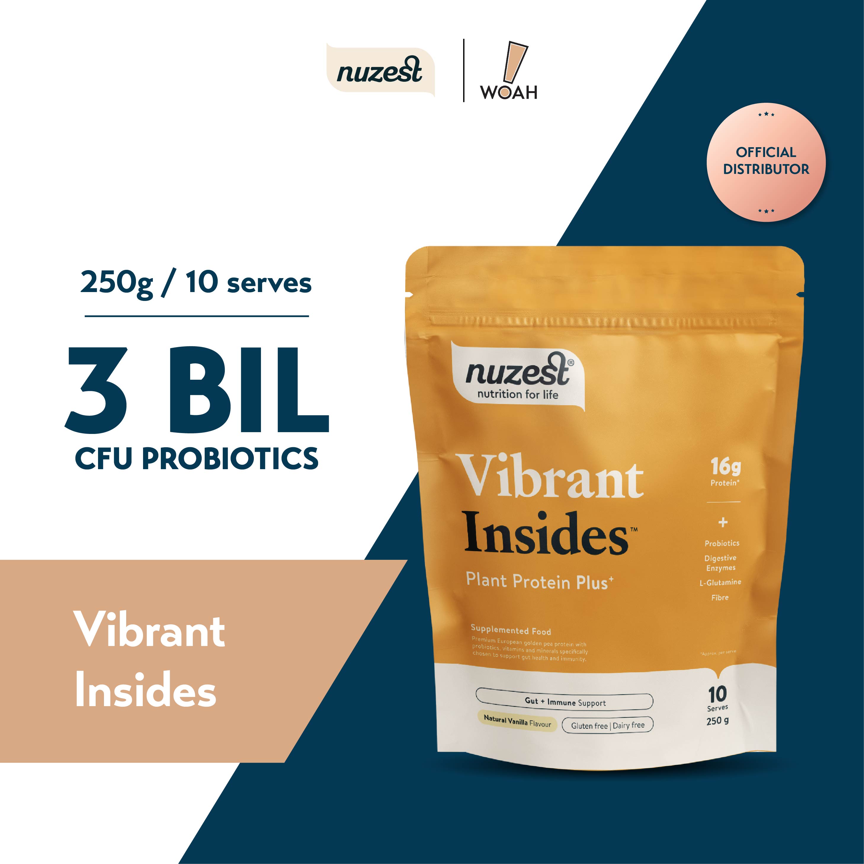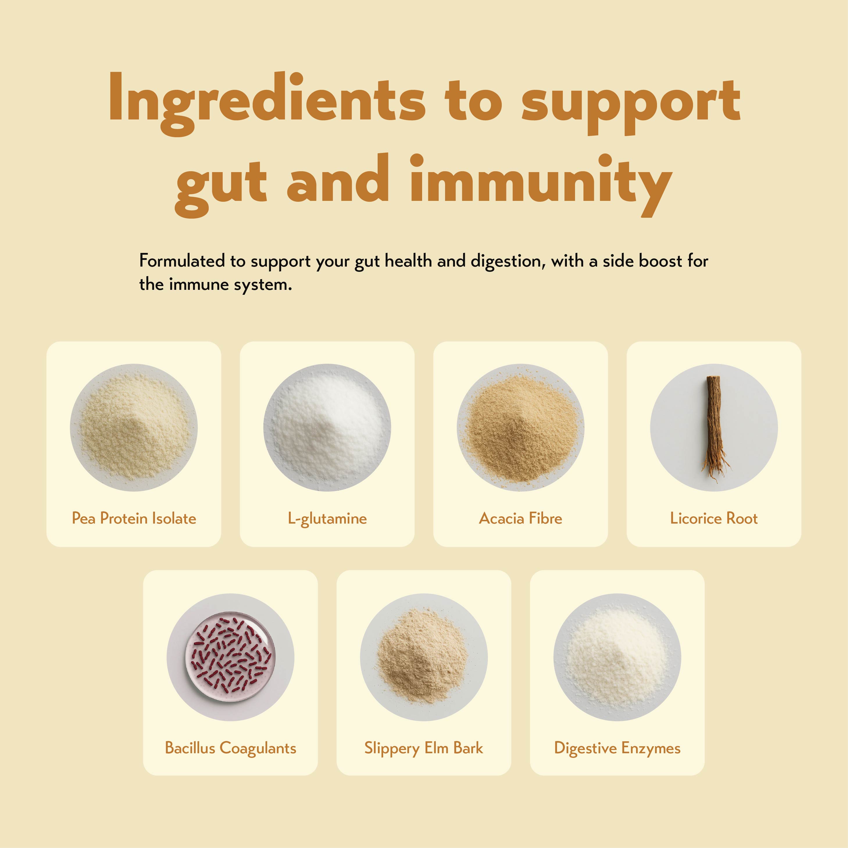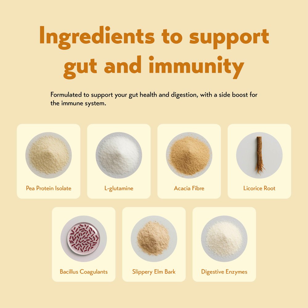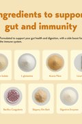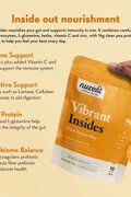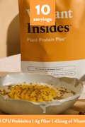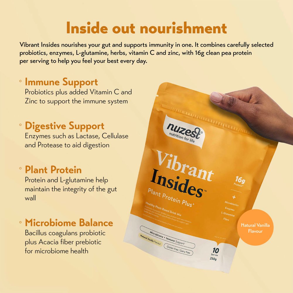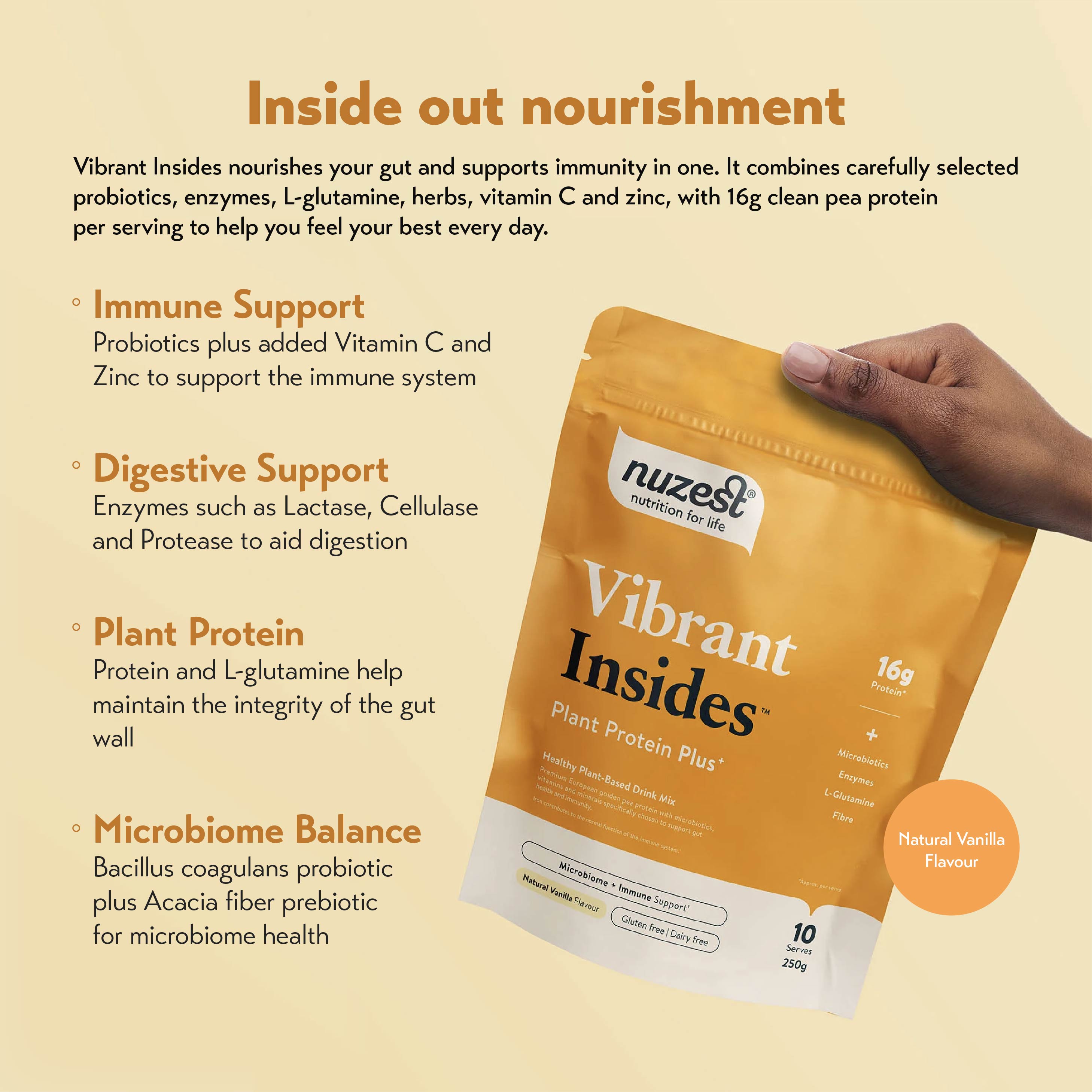 A gut and immune support blend with golden pea protein, shelf-stable probiotics, digestive enzymes, L-glutamine, slippery elm, zinc and vitamin C. Vibrant Insides is a plant-based drink mix that helps nourish your microbiome and support daily digestive and immune health.