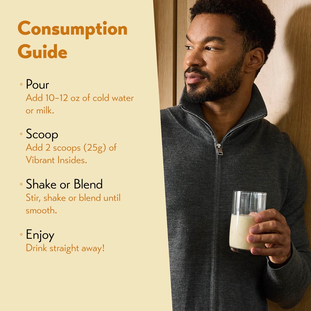Designed to fit into your daily routine, Vibrant Insides blends well with water, milk or into your go-to smoothie. It’s vanilla flavor and smooth texture make it an easy everyday addition.