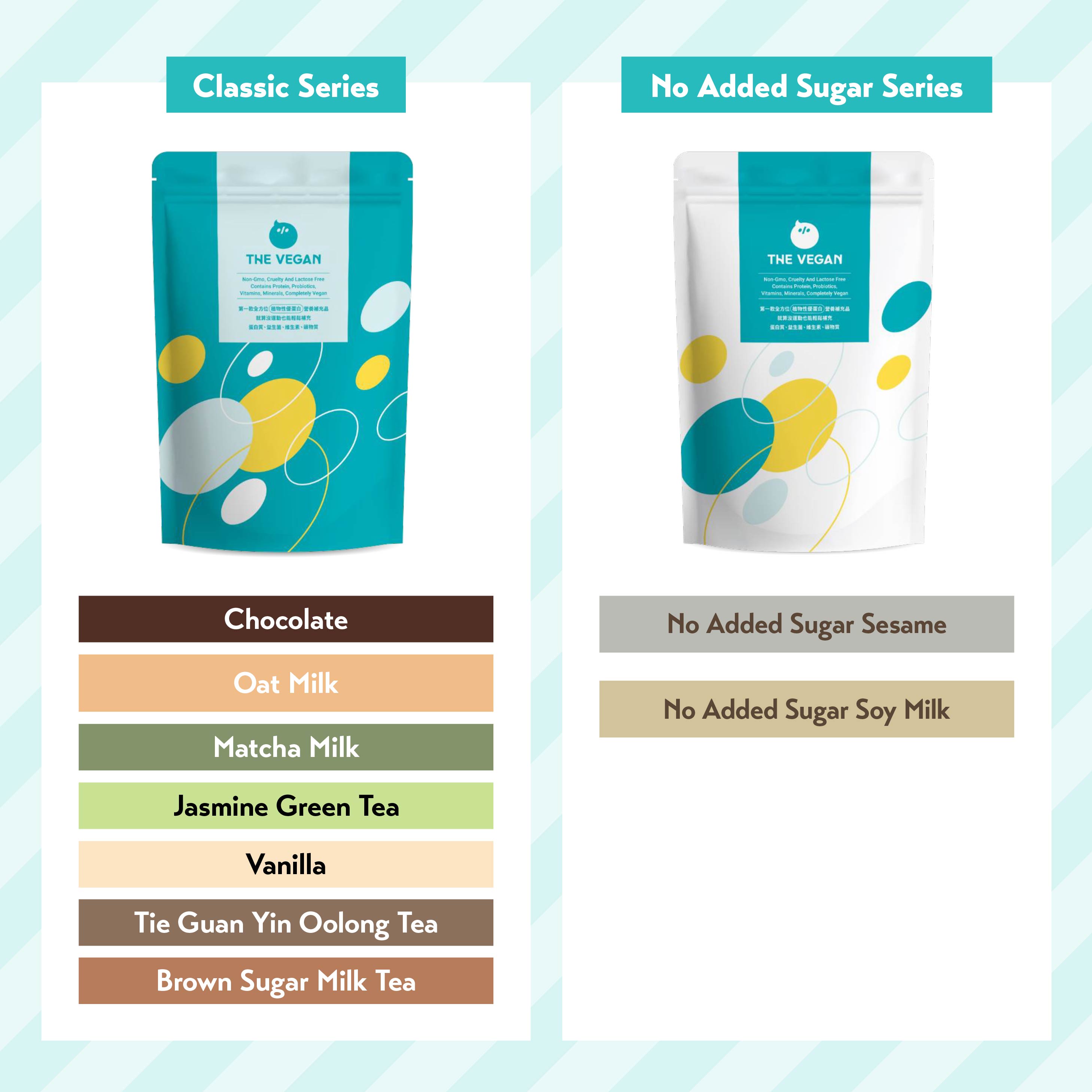 Classic Series: Chocolate, Oat Milk, Matcha Milk, Jasmine Green Tea, Vanilla, Tie Guan Yin Oolong Tea, Brown Sugar Milk Tea