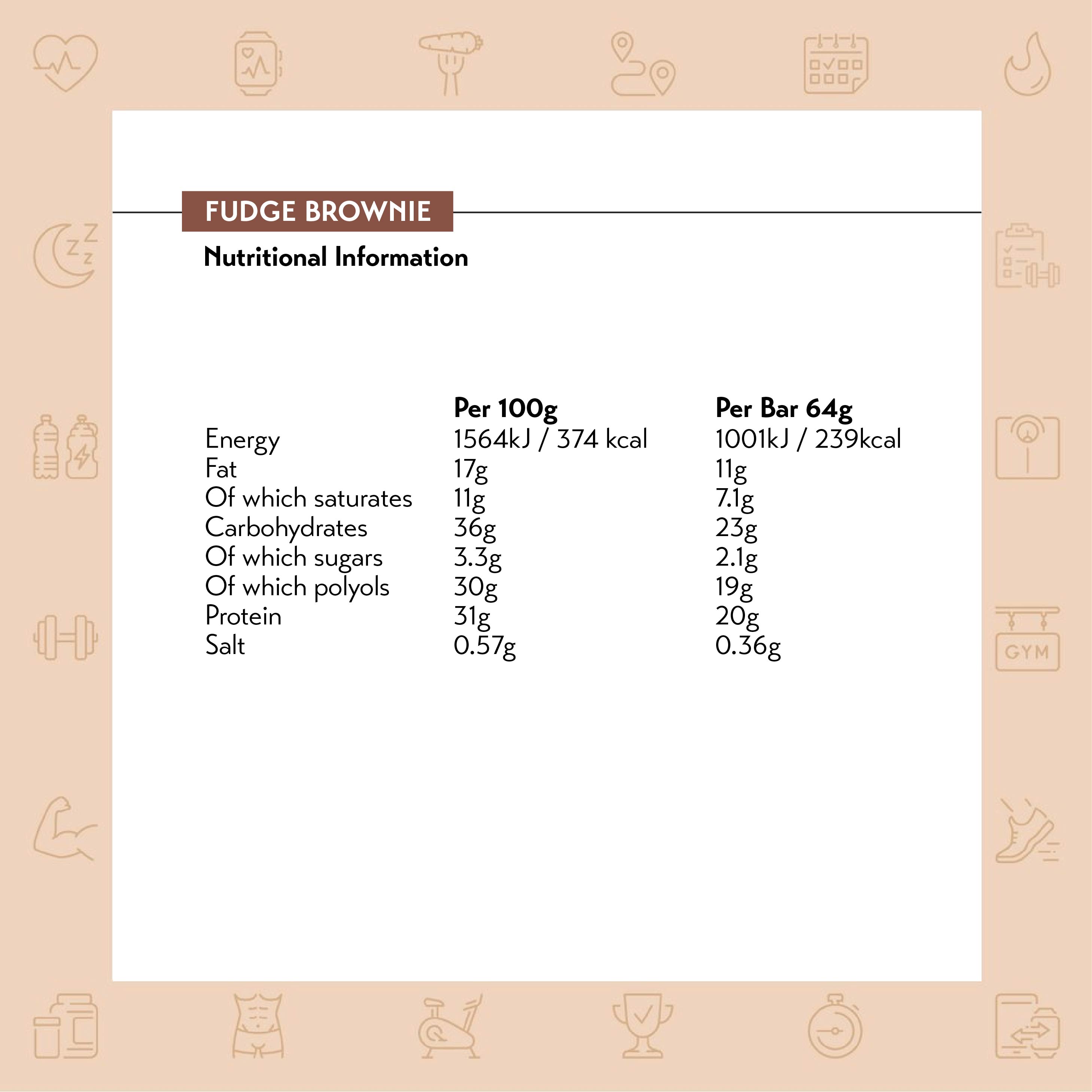 | Fudge Brownie: Milk Chocolate with Sweetener (31%) (sweetener maltitols, cocoa butter, whole milk powder, cocoa mass, emulsifier lecithins (soya), vanilla extract), chocolate flavoured caramel layer with sweetener (16%) (sweetener maltitols, condense milk, cocoa butter, humectant sorbitols, flavouring, emulsifier mono and diglycerides of fatty acids, colour plain caramel, natural flavoruing, salt), milk protein, collagen hydrolysate, cocoa soya crispies (8.6%) (soya protein, cocoa powder, tapioca starch), humectant glycerol, soya protein, coconut fat, nonpareil with sweetner (1.6 %) (sweetner xylitol, corn starch, colouring food (concentrate of apple, blackcurrant, radish, safflower, spirulina, lemon) beetroot juice concentrate, thickener arabic gum, glazing agent carnaubawax), fat-reduced cocoa powder, flavouring. |