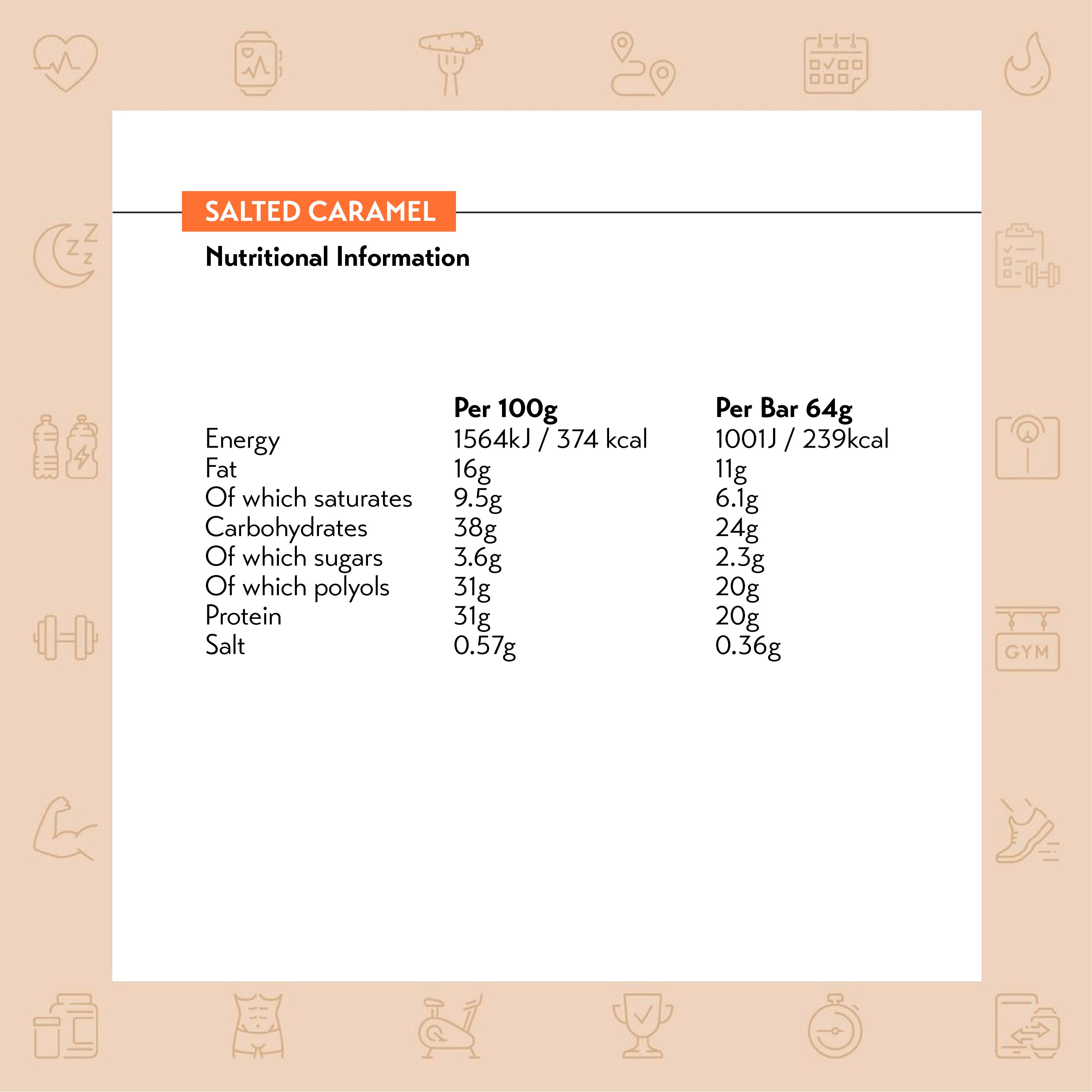 | Salted Caramel: Milk chocolate coating with sweetener (31%) (sweetener maltitol, cocoa butter, whole milk powder, cocoa mass, emulsifier lecithins (soya), vanilla extract), caramel layer with sweetener (18%) (sweetener maltitol, condensed milk, cocoa butter, humectant sorbitol, emulsifier mono and diglycerides of fatty acids, flavouring, salt, colour plain caramel), milk protein, collagen hydrolystate, soya crispies (8.6%) (soya protein, rice flour, barley malt extract, salt) humectant glycerol, soya protein, water, palm fat, flavouring, bulking agent,microcrystalline cellulose, color carotenes |